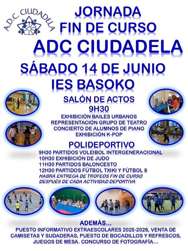 Casi no nos hemos dado cuenta pero un año más, las actividades de ADC Ciudadela llegan a su fin. Nuestros chicos y chicas que han participado en las extraescolares están ansiosos por compartir todo lo aprendido durante este curso y nos esperan en la Jornada de Fin de Curso que tendrá lugar este SÁBADO, 14 DE JUNIO, en la sede de IES Basoko.