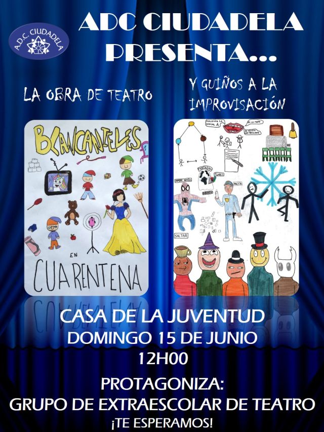 Señoras, señores, el espectáculo va a comenzar. El domingo 15 de junio tendremos el privilegio de comprobar el talento de la actividad de Teatro de ADC Ciudadela, con una representación a las 12h00 en la Casa de la Juventud, a la que estáis todos invitados.