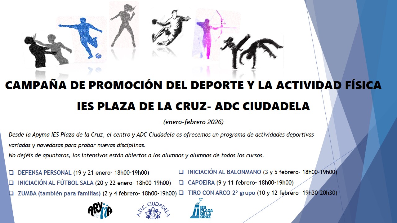 IES Plaza de la Cruz y ADC Ciudadela hemos preparado un completo programa para enero-febrero para la PROMOCIÓN DEL DEPORTE Y LA ACTIVIDAD FÍSICA para los alumnos y alumnas de centros asociados y usuarios de ADC Ciudadela a partir de 6º de Primaria con el fin de que probéis nuevas actividades y descubráis posibles nuevas aficiones.